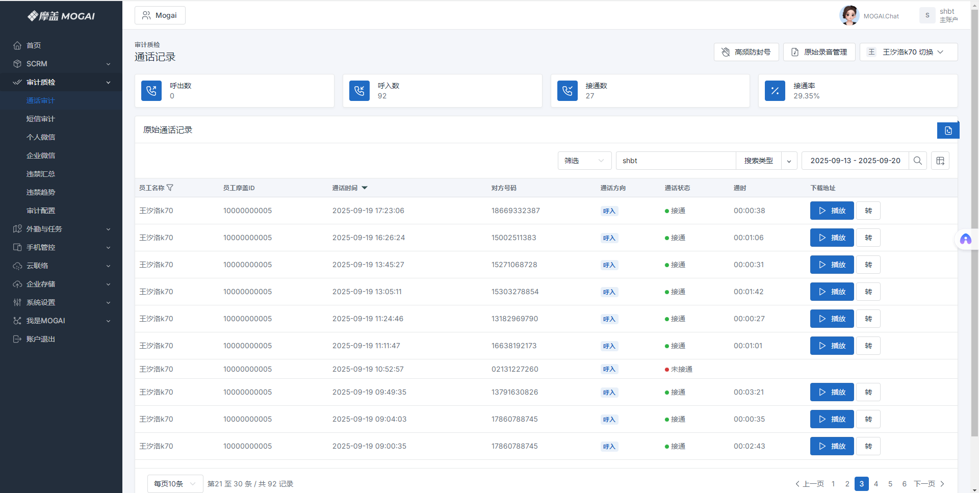 通话记录统计分析,自动计算通次,携带语音转文字(T2S)识别功能,结合业务违规字词库,对疑似违规的通话自动甄别上报。